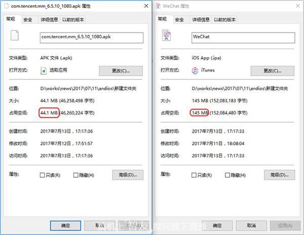 两个都是压缩包文件,但是两者的压缩率是不同的,比如安卓版微信apk文件,在Windows系统上大小为44.1MB,解压之后大小为93.7M,而iOS版的微信ipa文件大小为145MB,解压之后为186MB。所以,apk的压缩率是要远大于ipa的。