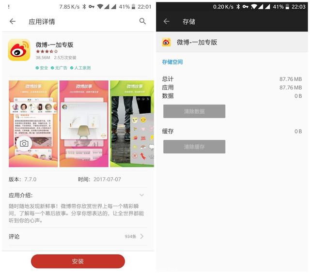 首先来看看安卓里的新浪微博,机型为一加3T,在应用商店里的大小为38.56M,然后安装之后大小为87.76M。