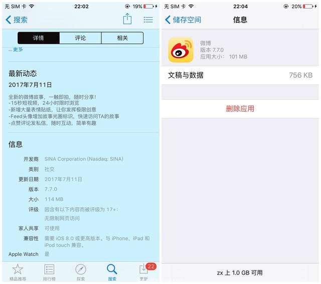 然后再来看看iOS里的新浪微博,机型为iPhone 6,商店显示大小为114M,但是实际安装居然更小了,只有101M!原因大概是APP Store里的大小应该是以最新的iPhone 7 Plus作标准的。