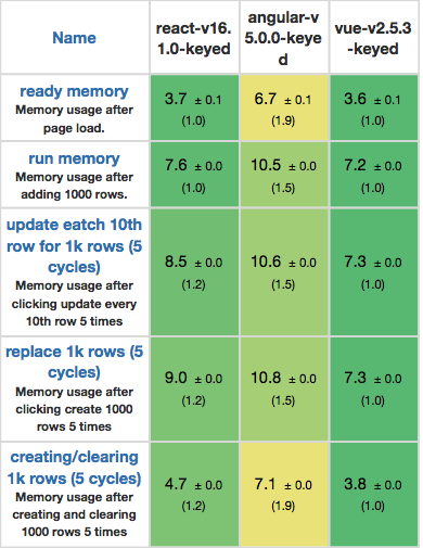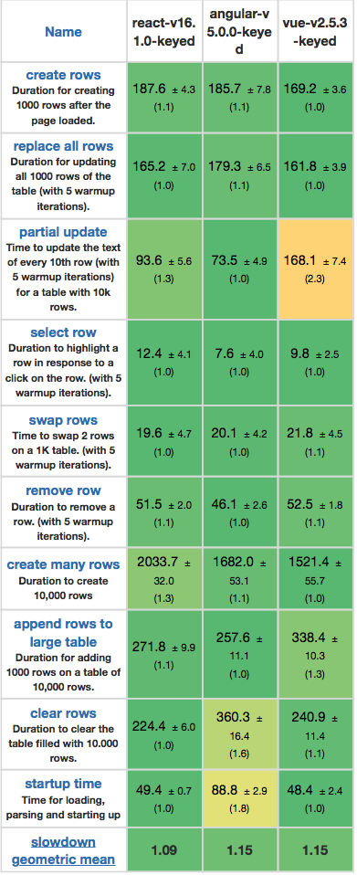 正如以下基准测试的数据,Vue.js在各方面都提供了非常好的性能: