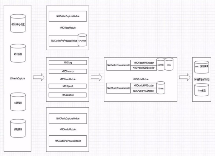 鉴于推流的主流程分为上述描述的4个部分:音视频采集、音视频前处理、音视频编码、音视频发送。因此将推流SDK进行模块划分为LSMediacapture层(对外API+服务器交互)、视频融合模块(视频采集+视频前处理)、音频融合模块(音频采集+音频前处理)、基础服务模块、音视频编码模块、网络发送模块。