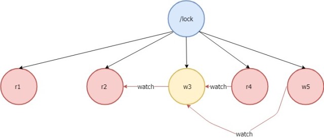 改动互斥锁方案,如果是写锁,监听他次小的节点,次小节点释放锁后,写锁检测是否还有更小的节点,如果有继续监听,如果没有获得写锁执行;如果是读锁,监听左侧最大的写锁,当写锁释放后就获得读锁。