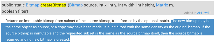 这个函数返回的 Bitmap 有可能和 source bitmap 是同一个,在回收的时候,需要特别检查 source bitmap 与 return bitmap 的引用是否相同,只有在不等的情况下,才能够执行 source bitmap 的 recycle() 方法。