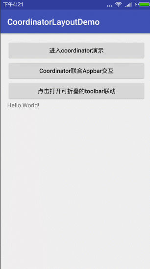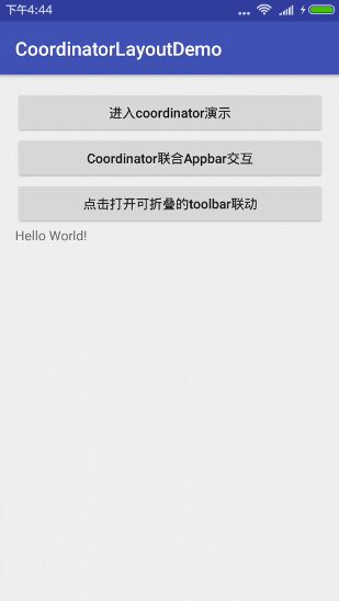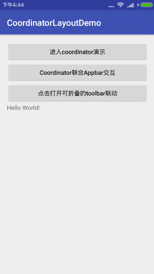 });这样一来,我们就完成了为 TextView 和Button 设置跟随移动这个交互行为。很简单有木有,其实为 CoordinatorLayout 的子 View 设置交互行为只需三步: