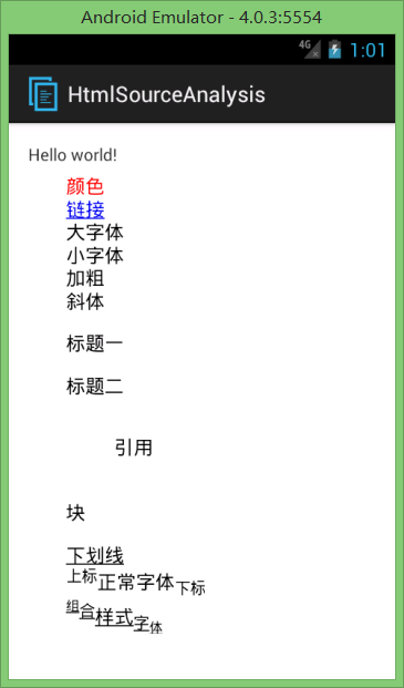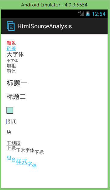使用Html.toHtml方法能够将带有样式效果的Spanned文本对象生成对应的Html格式,标签内的字符会被转译成,下面为WebView显示效果,部分效果与上面TextView显示的效果有差异,代码如下: