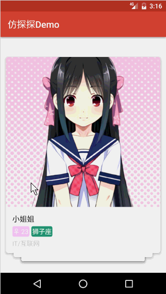 偶然之间发现探探的左右滑动的图片挺好玩,试着去做了下,再到后来,看到许多大神也推出了同样仿探探效果的博客,从头到尾阅读下来,写得通俗易懂,基本上没什么问题。于是,实现仿探探效果的想法再次出现在脑海中。那么,还犹豫什么,趁热来一发吧!就这么愉快地决定了。