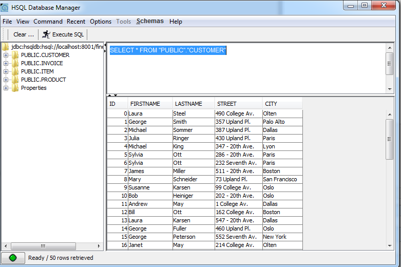 ResultSet rs = state.executeQuery("SELECT FIRSTNAME,LASTNAME FROM customer"); while (rs.next()) {