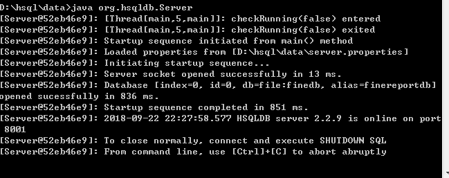 5.打开命令窗口,进入当前文件夹输入服务端命令:java org.hsqldb.Server。提示成功数据库说明已经成功启动并连到.data文件了,如果提示sql有问题可以去finedb.script中修改脚本。