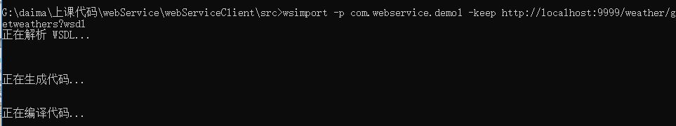 G:\daima\上课代码\webService\webServiceClient\src>wsimport -p com.webservice.demo1 -keep http://localhost:9999/weather/getweathers?wsdl