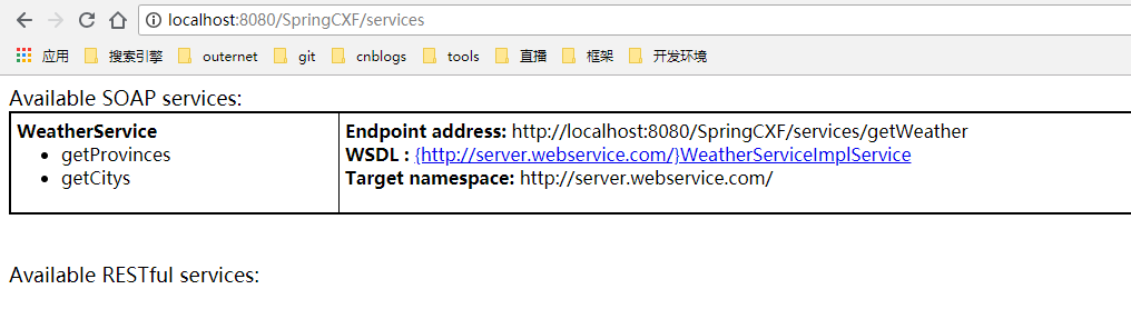 然后我们直接跑这个项目,我们不需要添加任何的页面,它自己会生成页面但是我们会报404的错误,因为在web配置中你直接访问项目会默认查询index.html,index.jsp等这也默认访问的页面。我们可以下连接下访问路径services,这个路径是我们在web.xml中配置的路径。访问:http://localhost:8080/SpringCXF/services,然后我们会看到如下页面:
