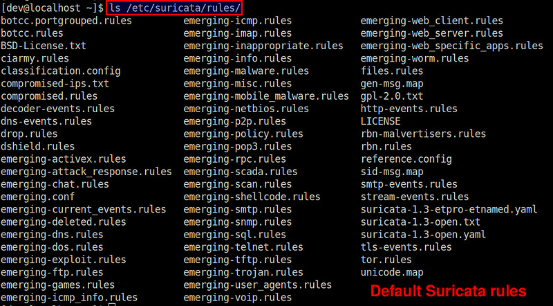 以上的规则安装命令会从 EmergingThreats.net 上下载可用的社区规则集快照,并且将其存储在 /etc/suricata/rules 目录下。