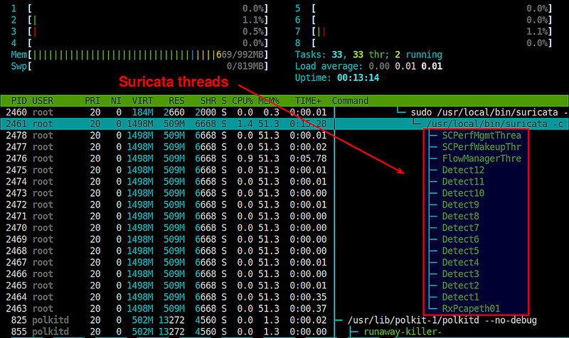 以下是一个关于Suricata处理的线程截图(由 htop 绘制)。