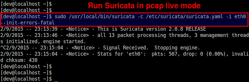 $ sudo /usr/local/bin/suricata -c /etc/suricata/suricata.yaml -i eth0 --init-errors-fatal