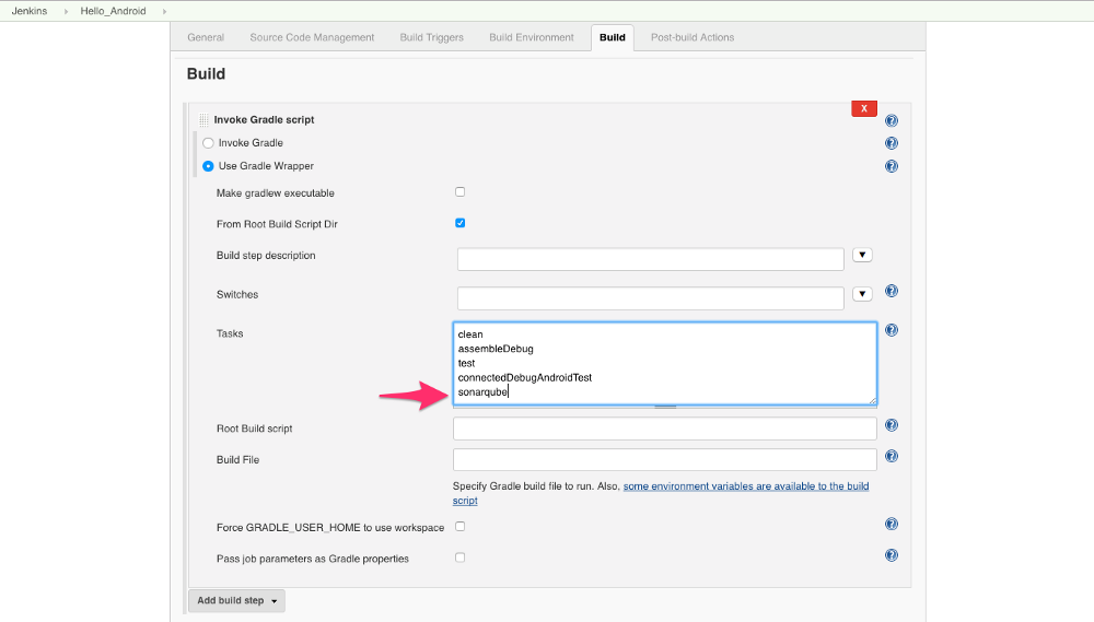 现在是见证魔法的时刻了增加一个 Build 步骤引入 Gradle 脚本选择 Gradle Wrapper (默认情况下Android 项目带有 Gradle Wrapper不要忘记把它检入到 Git 然后定义你要执行哪些任务
