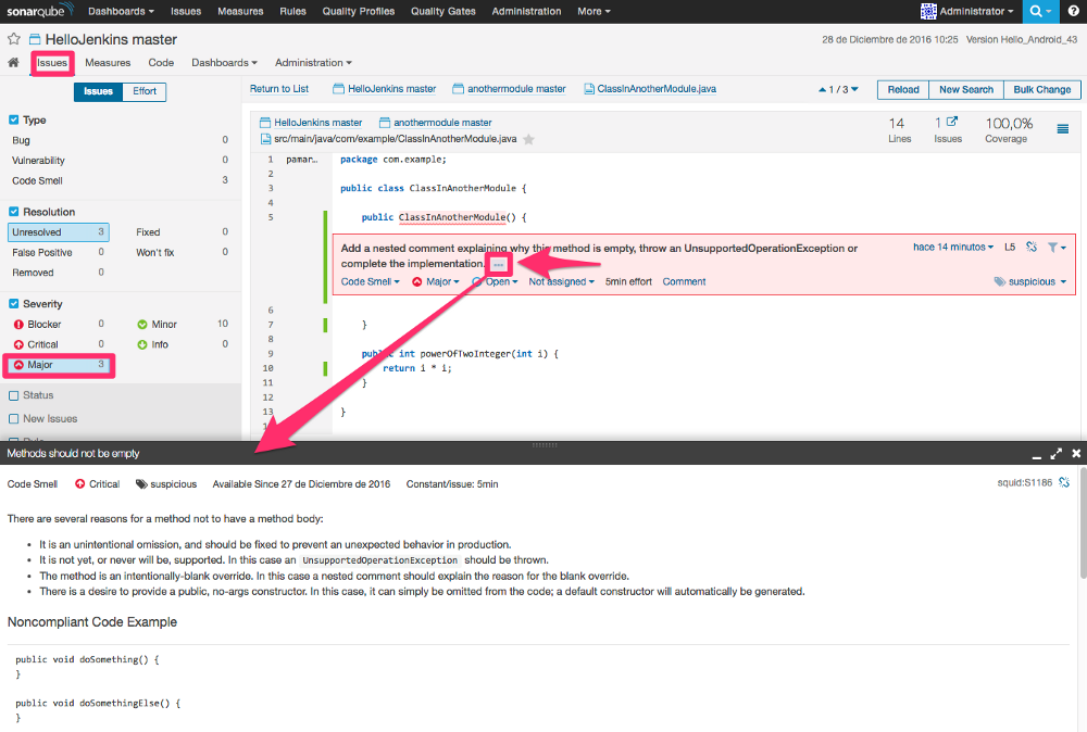 在下一屏我将展示一个主要问题它是一个空构造器方法。就我个人而言使用 SonarQube 最大的好处就是当我点击“...”时可以在屏幕底部显示解释。这是一个学习编程十分有用的技能。