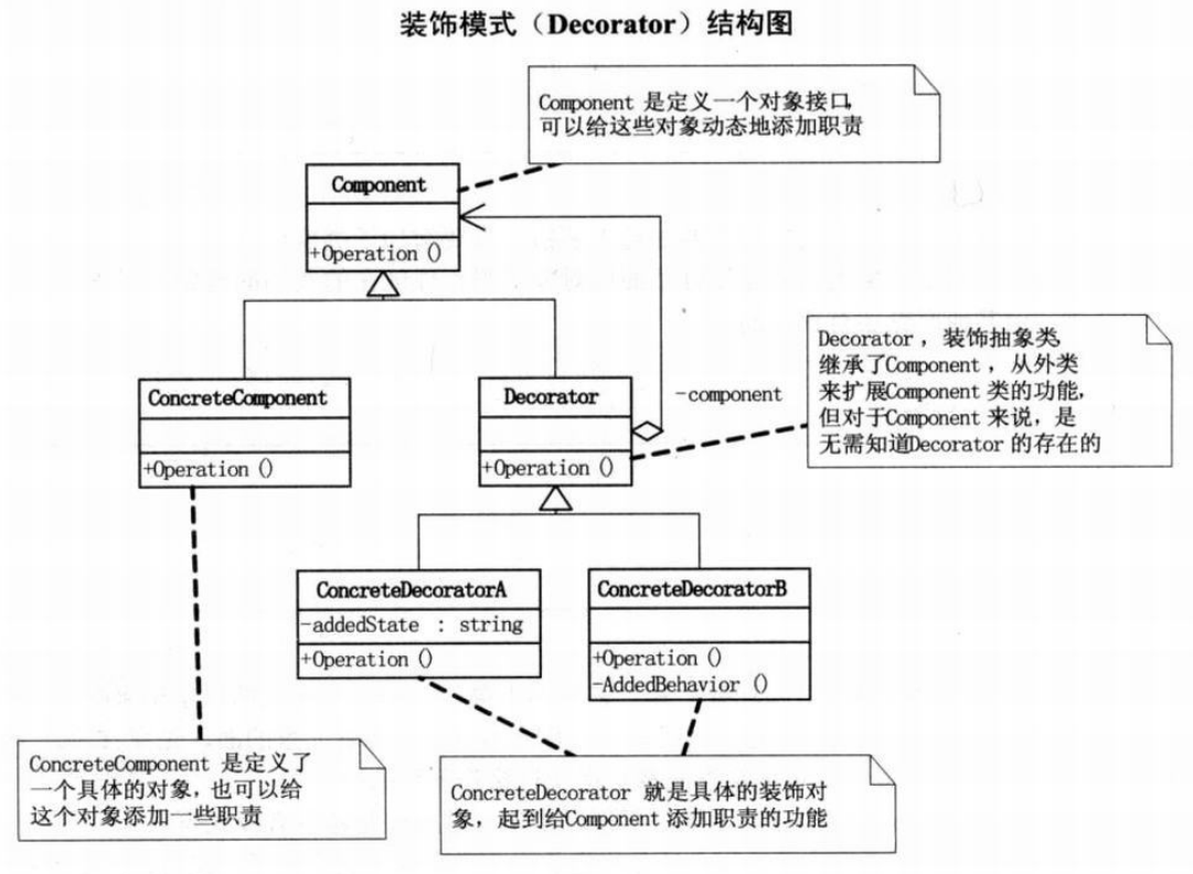 (再来一波生硬的概念...)"Component"是定义一个对象接口,可以给这些对象动态地添加职责。ConcreteComponent是定义了一个具体的对象,也可以给这个对象添加一些职责。Decorator,装饰抽象类,继承了Component,从外类来扩展Component类的功能,但对于Component来说,是无需知道Decorator的存在的。至于ConcreteDecorator就是具体的装饰对象,起到个Component添加职责的功能。