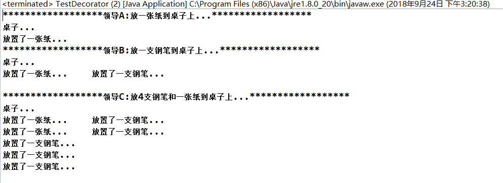 17 table.place();18 19 System.out.println();20 //再放一支钢笔在桌子上21 System.out.println("******************领导B:放一支钢笔到桌子上...******************");22 table = new Pen(table);23 table.place();24 25 System.out.println();26 System.out.println("******************领导C:放4支钢笔和一张纸到桌子上...******************");27 //再放4支钢笔和一张纸在桌子上28 table = new Pen(new Pen(new Pen(new Pen(new Paper(table)))));29 table.place();30 }31 }