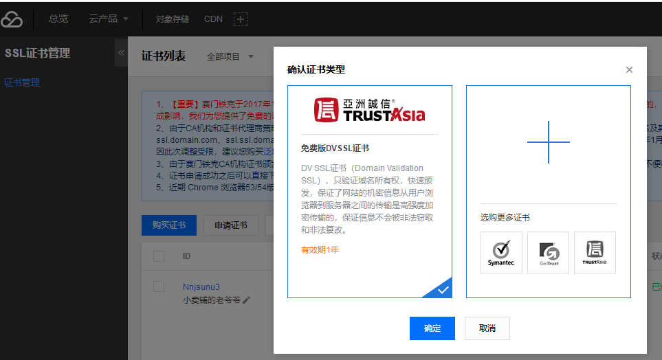 看了市面上各种类型的证书,有收费的也有免费的,但是最终还是选择了腾讯云提供的TrustAsia一年免费期的证书,没有次数限制,可以过期后再次申请。最主要的原因还是我懒,哈哈~~