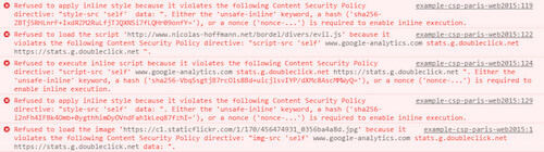 发生了什么?浏览器应用了指令并且拒绝了所有没有被授权的内容。它在浏览器调试终端中发送了这些通知: