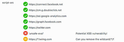 CSP 被设计用来降低跨站脚本攻击(XSS)的风险,这就是不建议开启内联脚本和 script-src 指令的原因。Firefox 对这个问题做了很好的说明:在浏览器中,敲击 Shift + F2 并且键入 security csp,它就会向你展示指令和对应的建议。这里有一个在 Twitter 网站中应用的例子: