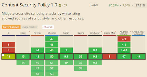 CSP 不是一个需要复杂的配置才能正常工作的每日构建特性。CSP 1 和 2 是候选推荐标准!浏览器可以非常完美的支持 CSP 1。