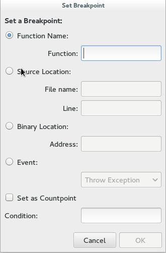 断点是很容易使用的。最快捷的方式是在一行代码上按下F8来设置一个断点。但是Nemiver在“Debug”菜单下也有一个更复杂的菜单,它允许你在一个特定的函数,某一行,二进制文件中的位置,或者类似异常、分支或者exec的事件上设置断点。