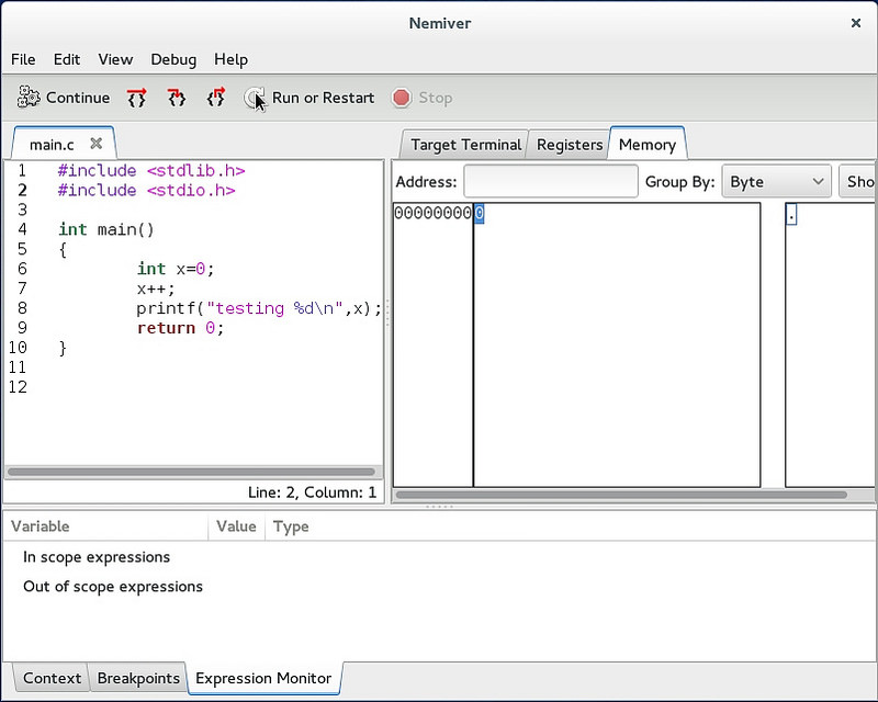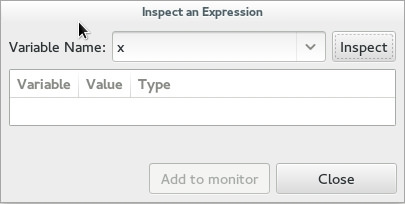 你也可以通过追踪来查看一个变量。在“Debug”中,你可以用一个表达式的名字来检查它的值,然后也可以通过将其添加到列表中以方便访问。这可能是最有用的一个功能,虽然我从未有兴趣将鼠标悬停在一个变量来获取它的值。值得注意的是,虽然鼠标悬停可以取到值,如果想要让它更好地工作,Nemiver是可以看到结构并给出所有成员的变量的赋值。