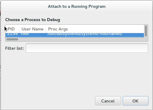 Nemiver允许你驳接到一个正在运行的进程进行调试。在“File”菜单,你可以筛选出正在运行的进程,并驳接到某个进程。