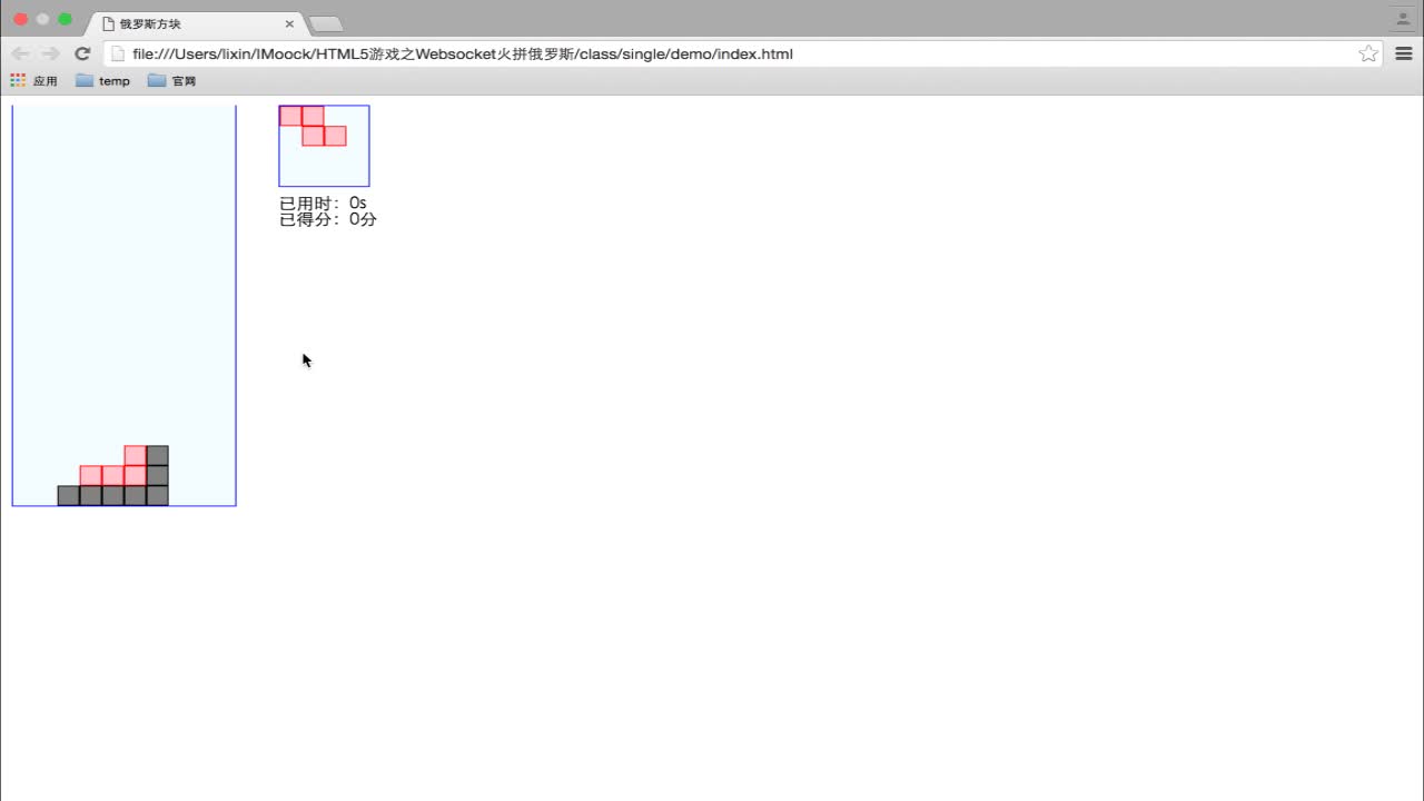 script.js div game:游戏区域 next:下一个方块现实的区域 info:显示信息的区域已用时已得分 引进样式 game: 游戏区域 20行10列 200px*400px 每个div是20*20的小块 next: 4*4 80px info:位置 。none 。current 。done 都是20*20 none:对应的区域没有方块背景色 current:用户正在操作的方块 done:已经落下的查看全部