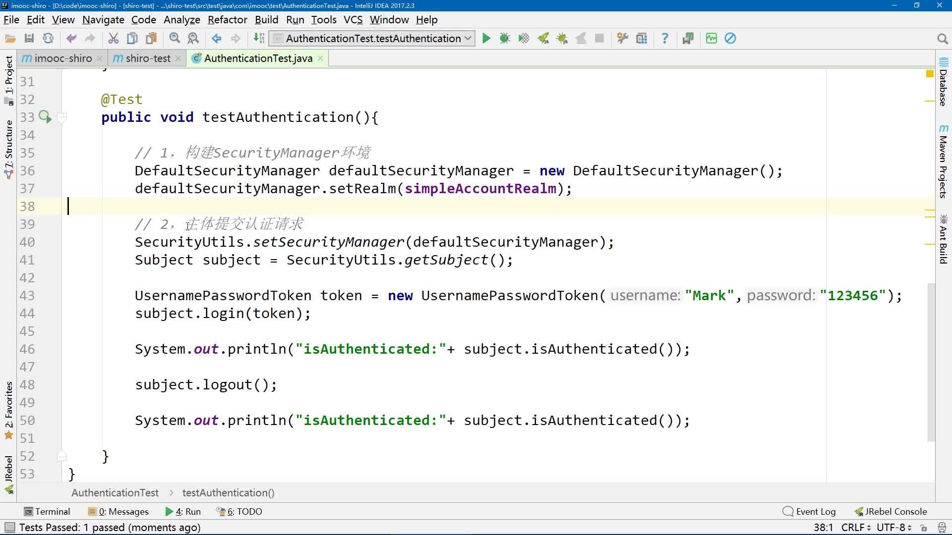 通过SecurityManager,Subject提交认证,SecurityManager认证调用Authenticatior认证调用Realm验证。
