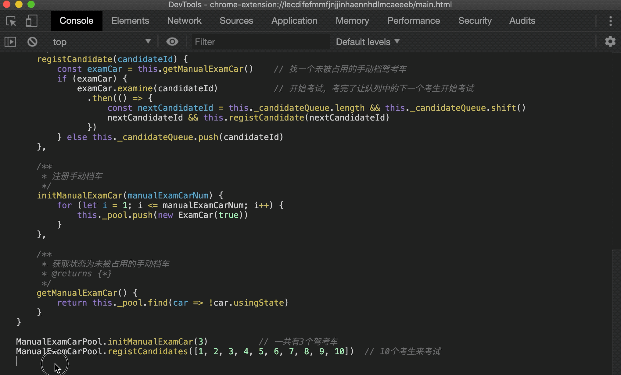 首先创建 3 个手动档驾考车,然后注册 10 个考生参与考试,一开始肯定有 3 个考生同时上车,然后在某个考生考完之后其他考生接着后面考。为了实现这个过程,这里使用了 Promise,考试的考生在 0 到 2 秒后的随机时间考试完毕归还驾考车,其他考生在前面考生考完之后接着进行考试: