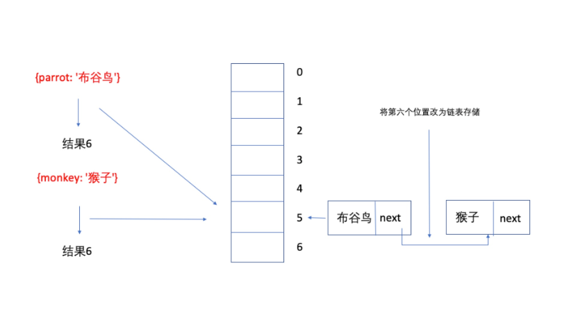 如果我们在添加元素的过程中发现要添加的位置已经有了一个元素存在,那么我们可以将这个地址的结构改变为链表存储。