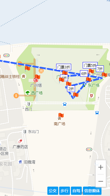 进行轨迹信息小红旗标位,点击小红旗进行信息窗口响应,用户足迹连线处理,调用高德地图公交、步行、自驾路线规则