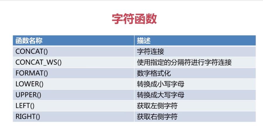 在mysql数据库中函数的使用 字符函数: 函数名称 描述 concat 字符连接 Concat_ws