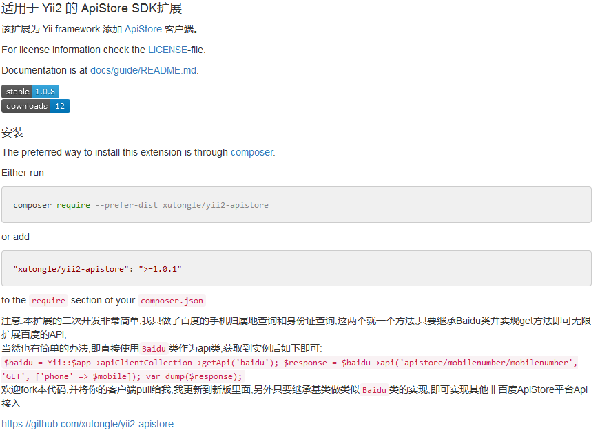 适用于 Yii2 的 ApiStore SDK扩展 该扩展为 Yii framework 添加 ApiStore