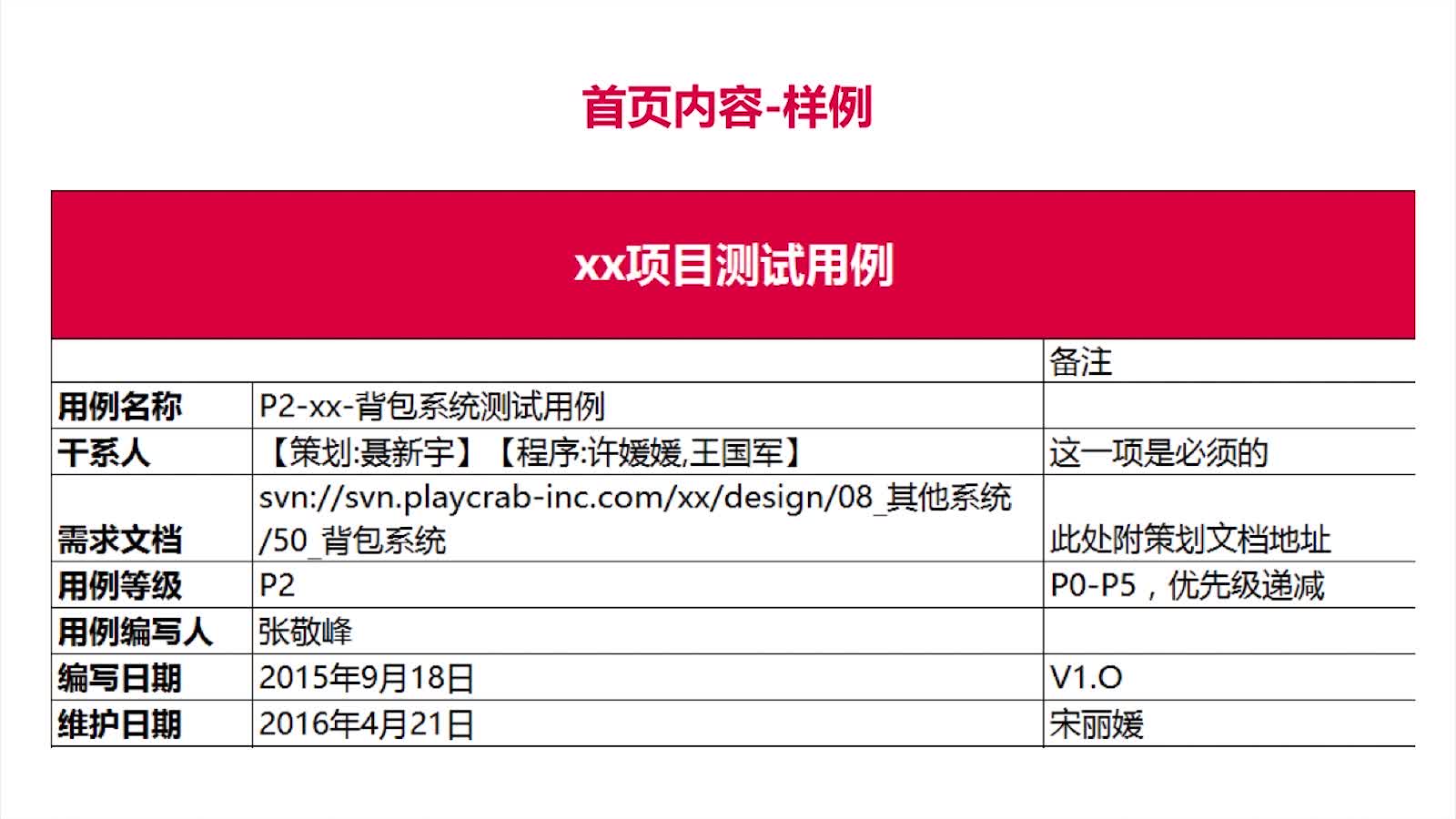 首页内容:(用例关键信息)用例名称;游戏版本;编写人,编写日期,备注;修改人,修改日期、修改备注;需求文档的链接或地址