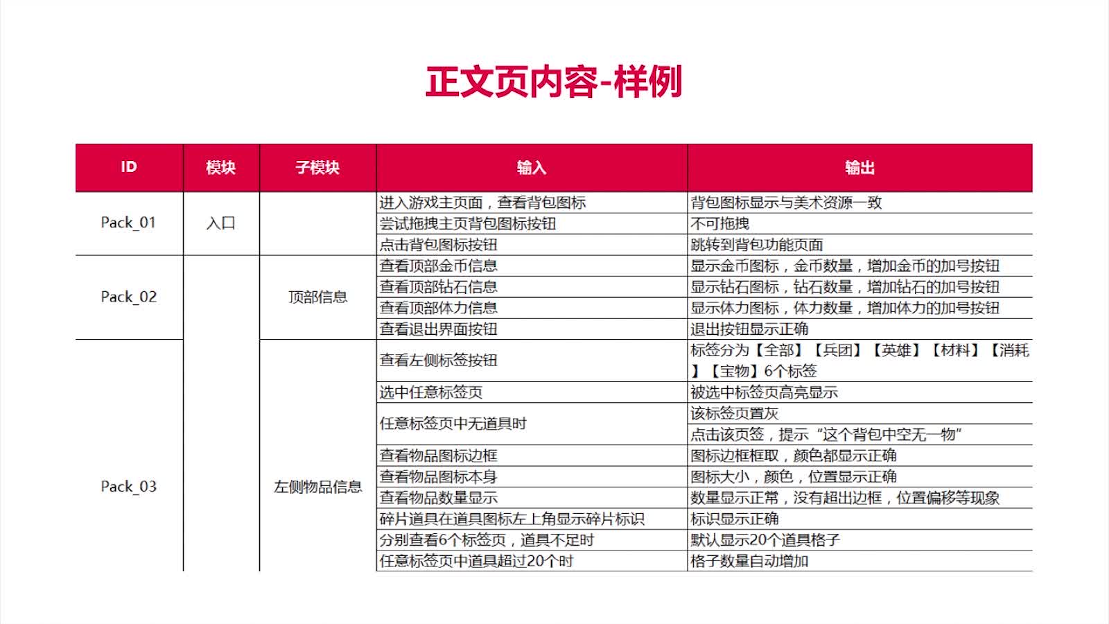 正文页内容:功能逻辑图(若有,便于理解)、用例id、模块名称、测试先决条件(入口)、输入信息、输出结果、备注信息