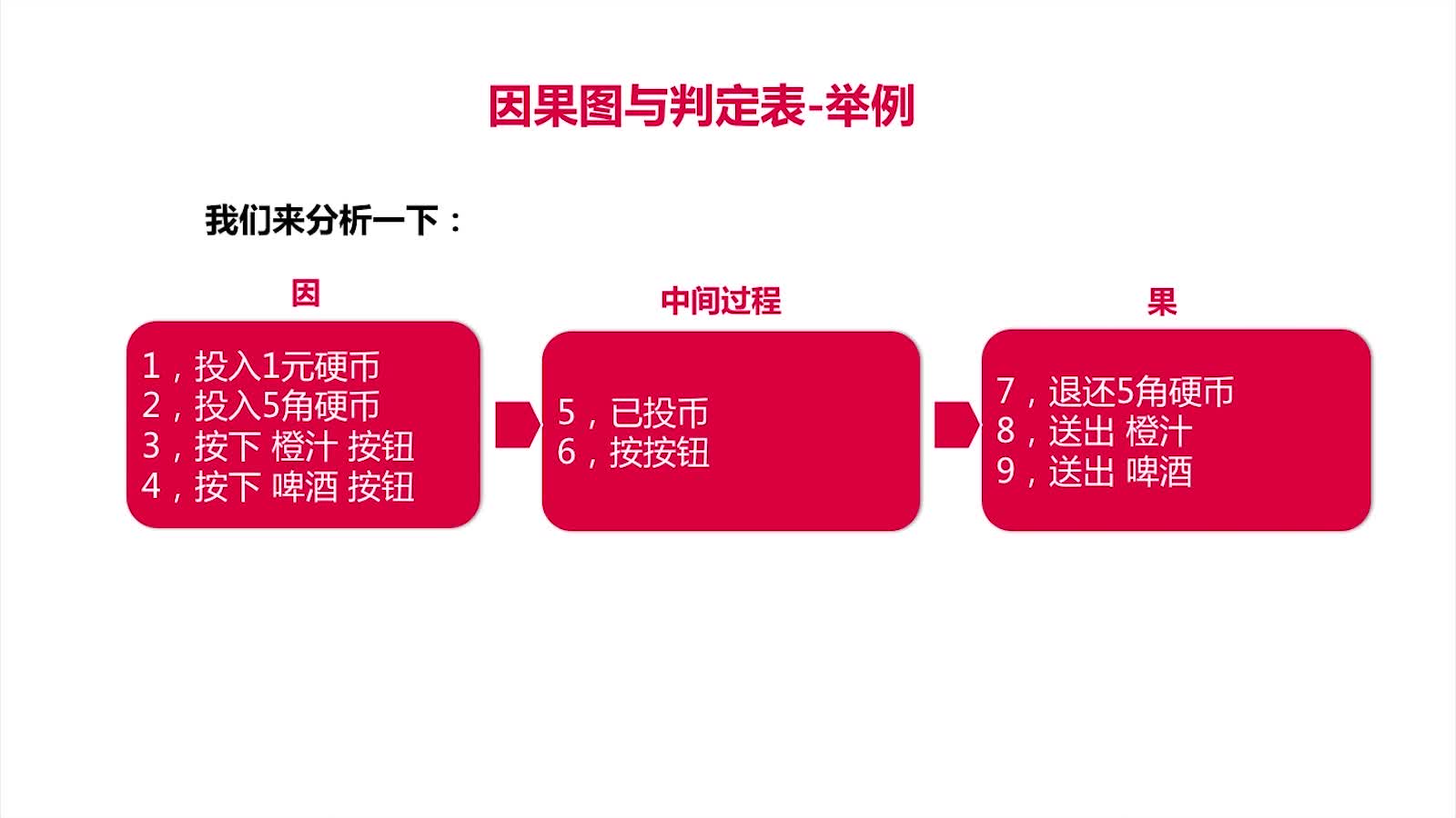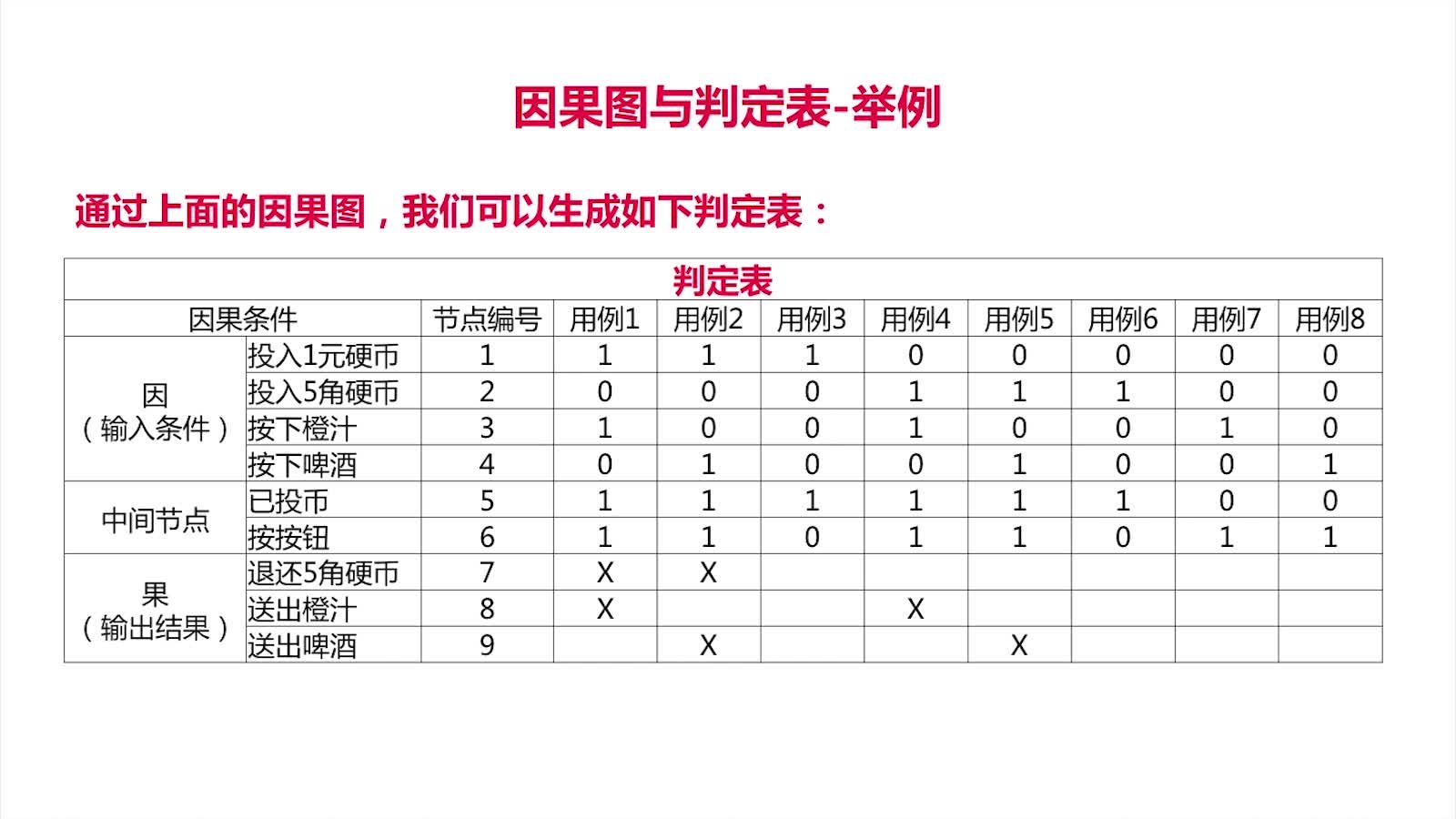 判定表:可以通过因果图来生成的一种结果判定表格(因、中间节点、果,01表示是否存在)